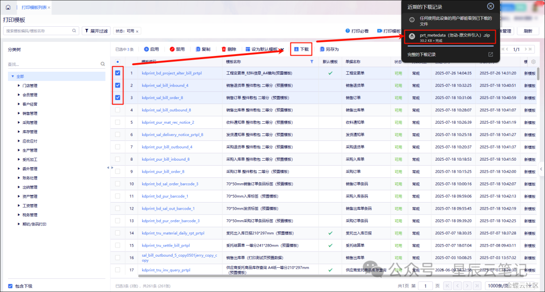 批量引入要怎么操作呢?首先,在打印模板列表选中要下载的多个模板,然后点击“下载”,生成一个含多个模板的文件,一般文件名是 “prt_metedata(勿动-原文件引入)”