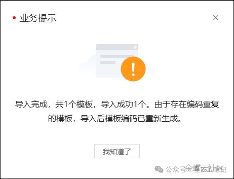 b)   新增导入:若存在编码相同的模板,编码重新生成再新增导入。导入成功也会有如下提示: