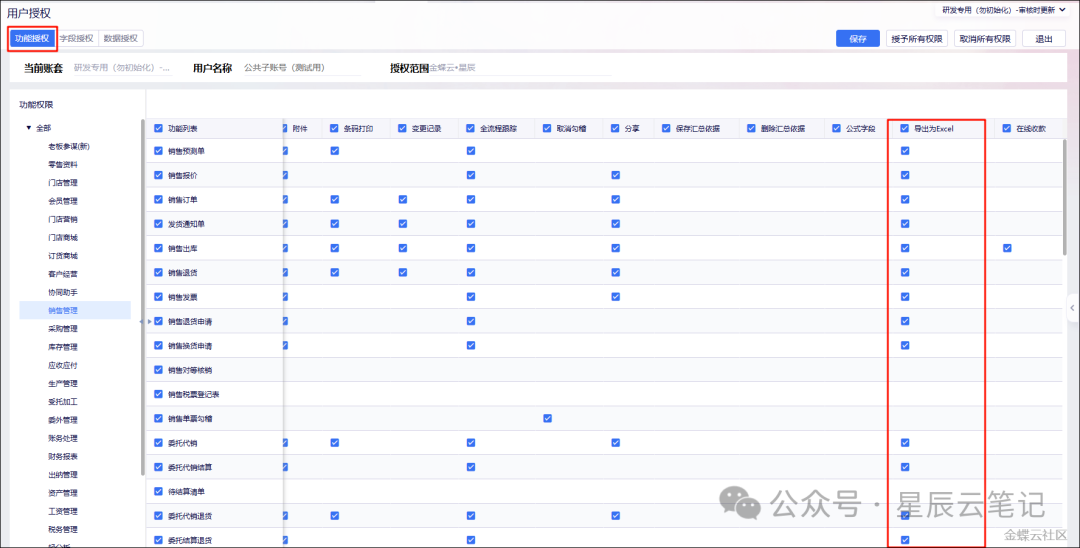 6)权限控制:支持导出excel的单据的【功能授权】中增加“导出为Excel”,默认不勾选,勾选后才可操作导出为Excel