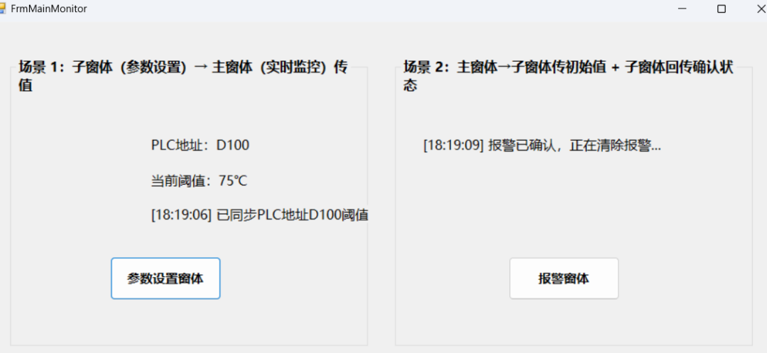 这是最常见的场景:操作员在子窗体修改 PLC 的阈值参数,修改后同步到主窗体显示并生效。