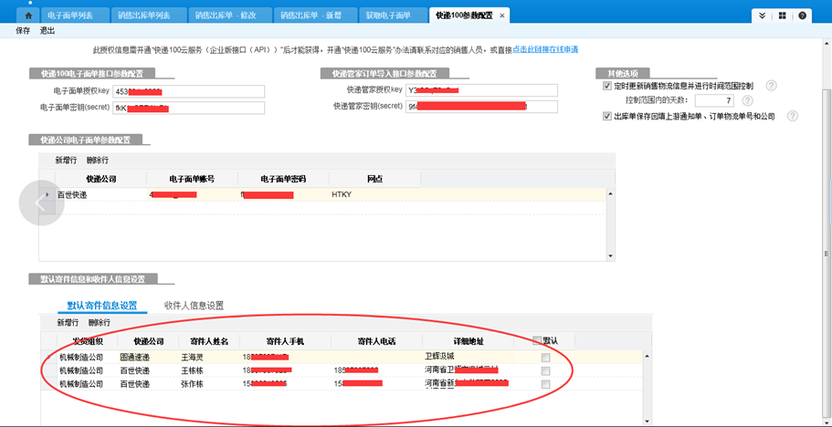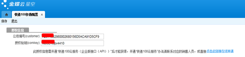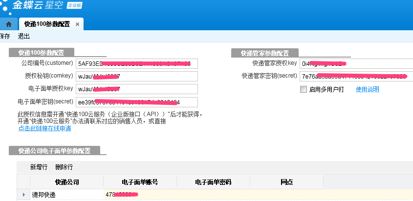 实时查询customer,客户授权Key,分别填到金蝶云快递100参数的公司编号和授权秘钥中获取快递单号,有两种方式:1、申请电子面单后自动回填快递单号;2、导入快递管家后打印快递单时自动回填快递单号。除了维护授权信息外,还需将上面的客户授权Key,电子面单secret,分别填到电子面单授权key和电子面单密钥(secret)中,并且维护快递公司电子面单参数配置中的电子面单(月结)账号密码等信息,电子面单(月结)账号密码需用户单独向合作的快递公司索取。然后打开获取电子面单,在明细中点击单据编号,选择返回数据,然后点击申请电子面单即可进行申请3.2申请成功后打开列表可以看到快递单号回填到单据上了,并且多了一个电子面单链接。3.4通过申请电子面单获取物流单号到单据上后,通过物流查询跳转到销售物流信息列表。此外手工维护好物流公司和物流单号,也是可以刷新物流信息回来的。3.5销售物流信息列表,点击刷新物流信息,即可将物流信息更新回金蝶云系统中。3.6支持子母单返回,在获取电子面单中,维护物品数量,并勾选是否需要子单,然后点击申请电子面单。即可返回子单,例如录5则返回母单1个,子单4个3.7支持签回单,在获取电子面单中勾选“是否需要签回单”即可