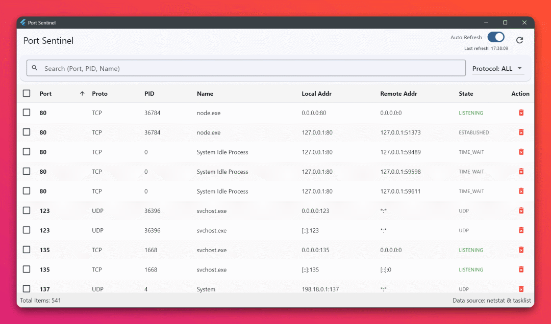 Windows 开发最烦的就是启动服务时报“端口被占用”。虽然 GitHub 上这个 Port Sentinel (作者 Sanjeever) 就是个专门解决这个痛点的 Windows 桌面应用。它是基于 Flutter 开发的,提供了一个直观的 GUI 让你查看谁占了坑,并一键结束进程。