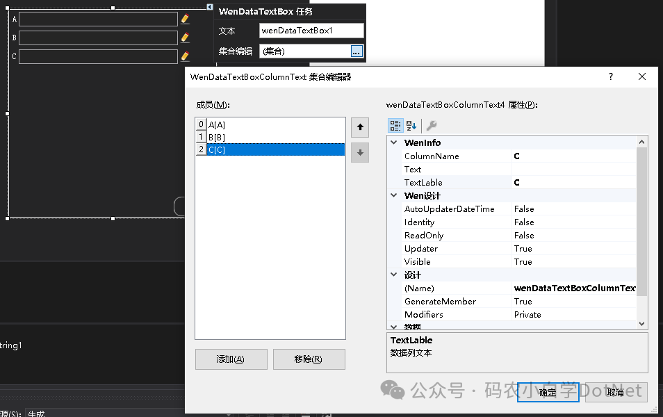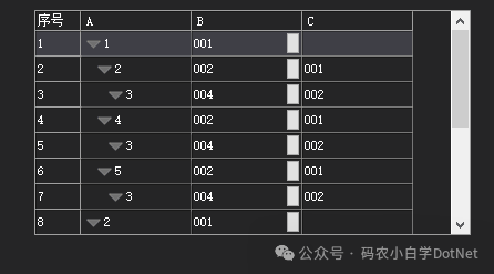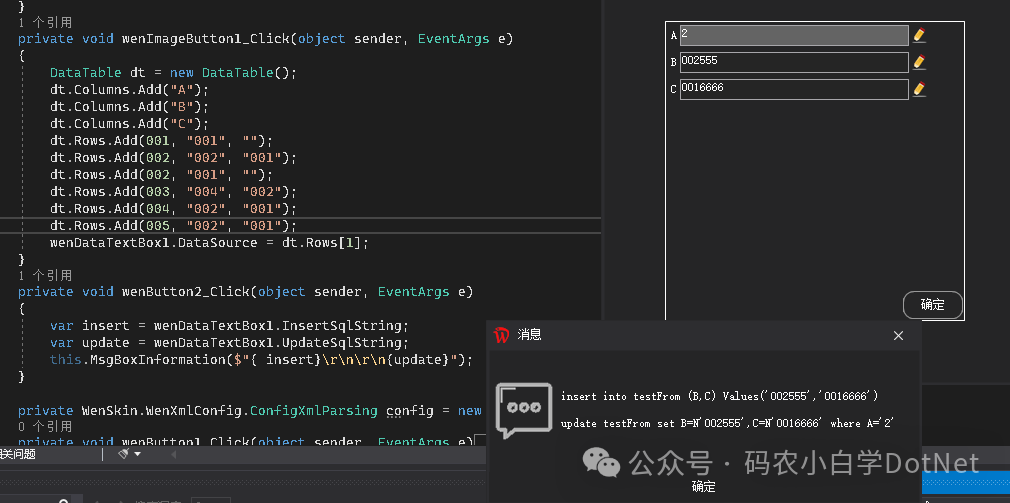 private void wenImageButton1_Click(object sender, EventArgs e){    DataTable dt = new DataTable();    dt.Columns.Add("A");    dt.Columns.Add("B");    dt.Columns.Add("C");    dt.Rows.Add(001"001""");    dt.Rows.Add(002"002""001");    dt.Rows.Add(002"001""");    dt.Rows.Add(003"004""002");    dt.Rows.Add(004"002""001");    dt.Rows.Add(005"002""001");    wenDataTextBox1.DataSource = dt.Rows[1];}private void wenButton2_Click(object sender, EventArgs e){    var insert = wenDataTextBox1.InsertSqlString;    var update = wenDataTextBox1.UpdateSqlString;    this.MsgBoxInformation($"{ insert}\r\n\r\n{update}");}