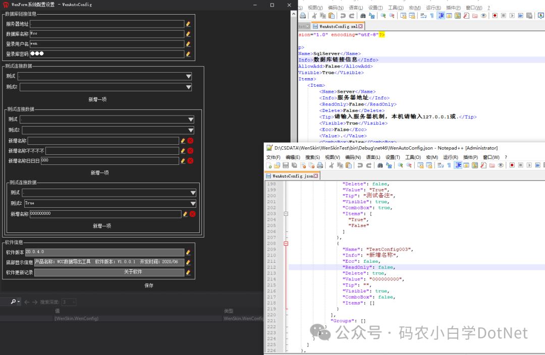 //初始化WenSkin.WenConfig wenConfig = new WenSkin.WenConfig();WenSkin.WenConfig wenConfigjson = new WenSkin.WenConfig(WenSkin.WenConfig.ConfigFormatEnum.Json);//获取或设置值var uid = wenConfig["SqlServer""Uid"];wenConfig["SqlServer""Uid"] = "wen";//显示窗口wenConfig.Show();