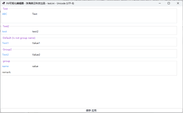 //初始化var ini = new Ini("test.ini");//设置值ini["Test1"] = "Value1";ini["Group2""Test2"] = "Value2";//获取值(不区分大小写)var test1 = ini["test1"];var test2 = ini["group2""test2"];//插入值ini.AddItem("group""name""value");//插入注释ini.AddRemark("group""remark");//显示可视化编辑器ini.Show();