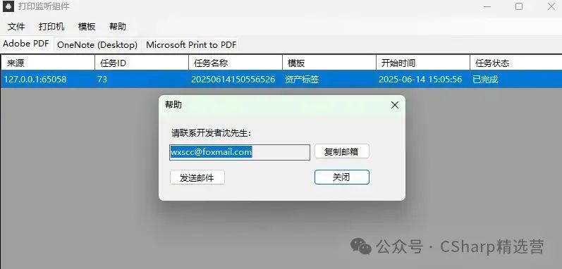 主窗体:采用 WinForms 界面,包含多标签页(TabControl),每个标签页对应一台本地打印机,便于分组管理。