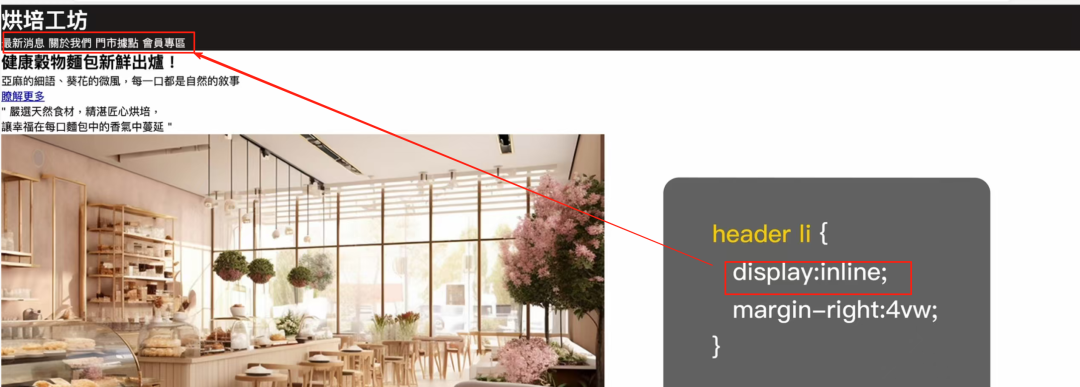 由于导航栏的<li>标签本身是区块元素,所以当前每一个导航栏都是独占一整行;呈纵向(上下)分布,与我们常见的网页导航栏横向视觉不符。