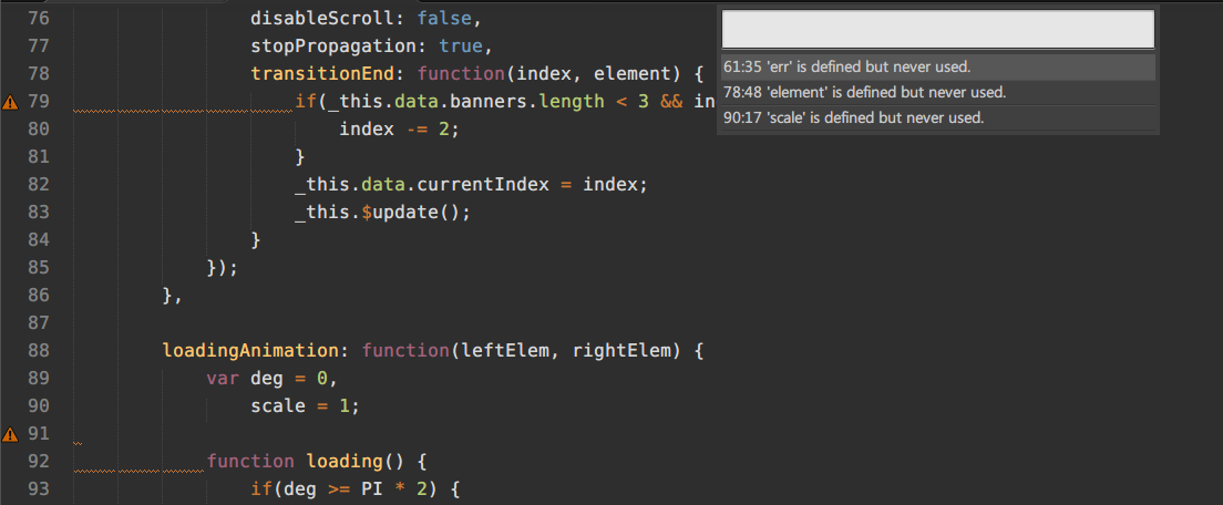 编辑器下一般直接显示在出错或者警告的行数处。比如Sublime3 下,在当前文件下,快捷键 Ctrl+Alt+J 就会显示信息( Ctrl+Alt+C 关闭信息显示):