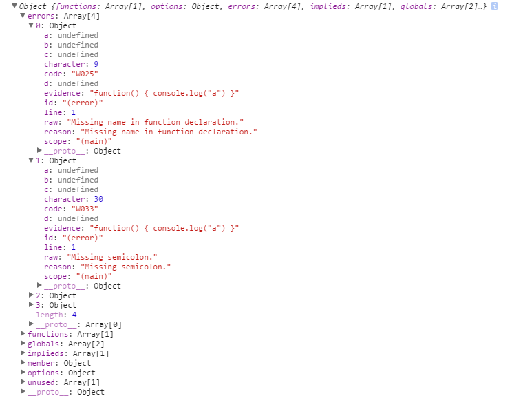 当result返回false的时候,代表语句中有错误,这时候调用 JSHINT.data() 就会得到错误的详细信息,看下面的示例: