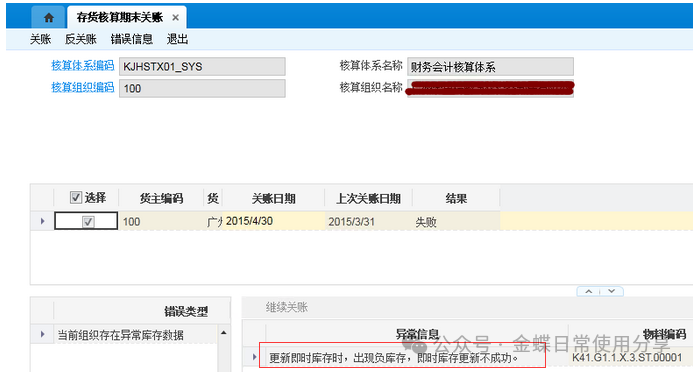 场景1:关账时提示“更新即时库存时,出现负库存,即时库存更新不成功”(如下图)