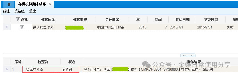 场景2:存货关账成功且未提示有负库存,结账时“负库存检查,不通过”(如下图)