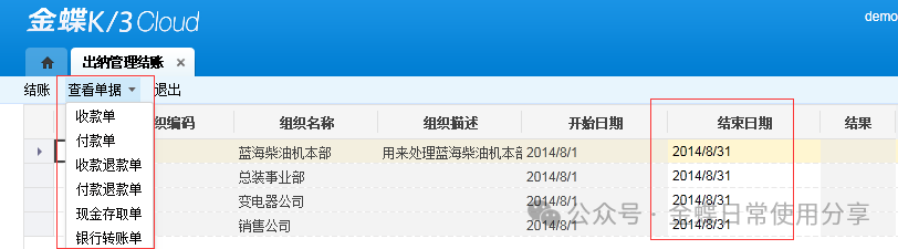出纳结账是将出纳流水按单据类型、日期等汇总的过程。按日期结账,无期间概念。