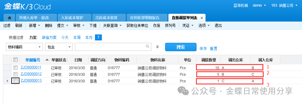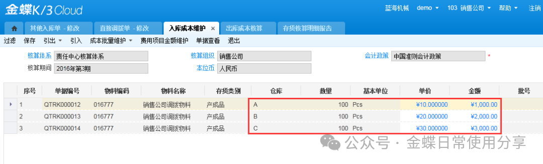 4)ZJDB000013直接调拨单以不包含嵌套业务单据ZJDB000012计算物料出库成本  30=3000/100;