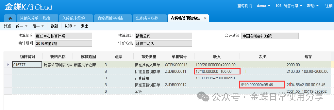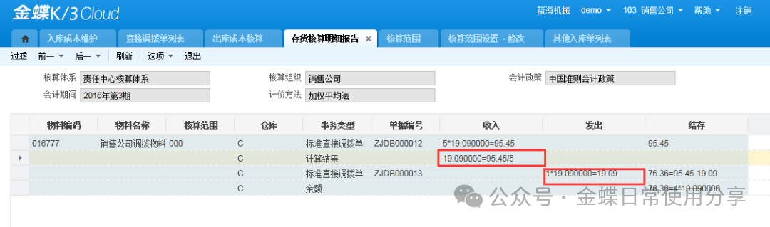 3)ZJDB000013直接调拨单以嵌套业务单据ZJDB000012计算物料出库成本 19.09=95.45/5;