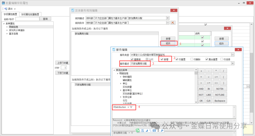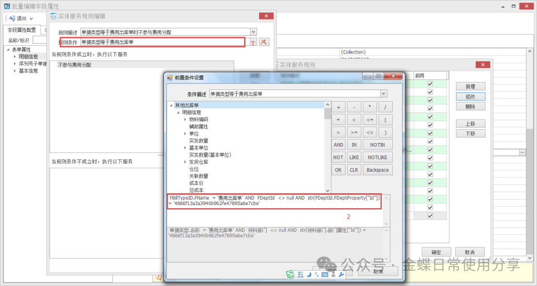 2.打开BOS新增“其他出库单”“明细信息”的“实体服务规则”,我这里新增“单据类型等于费用出库单时不参与费用分配”实体服务规则。