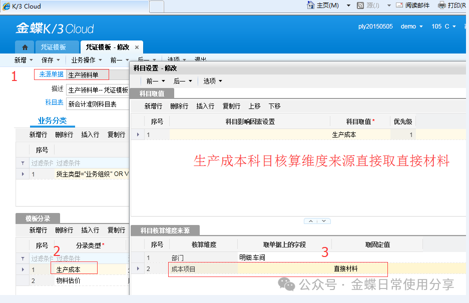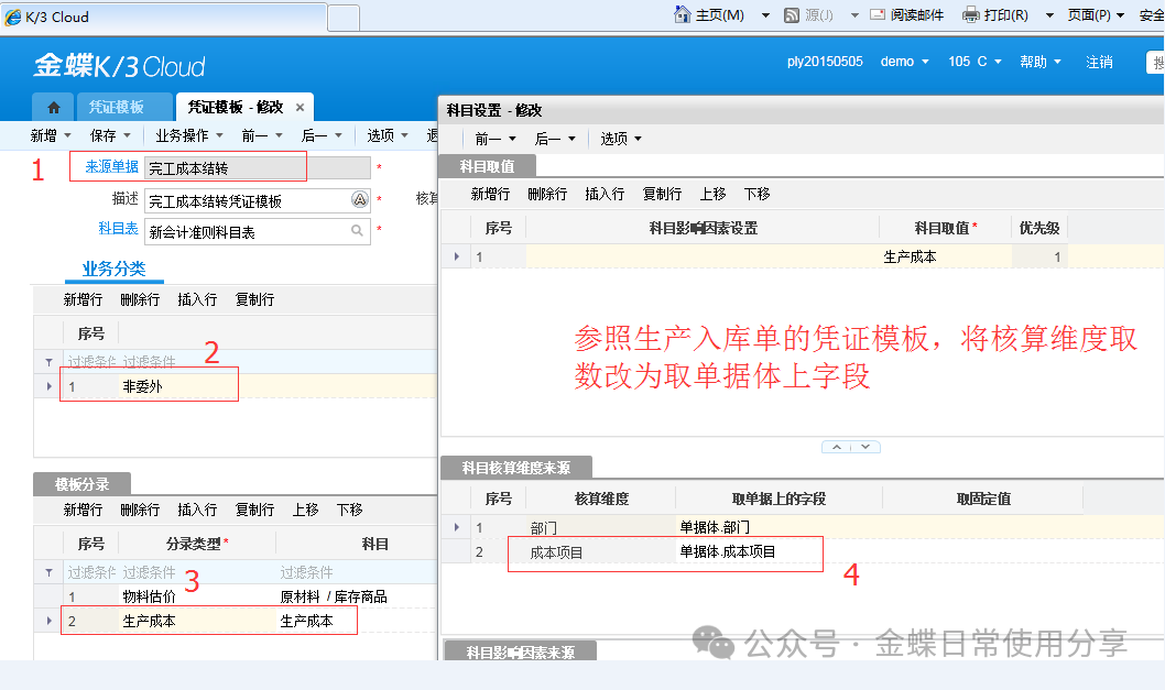 也就是说,生产成本发生的时候,通过在单据上增加“成本项目”字段。生产成本结转的时候,通过新增“完工成本结转”单据(承载“成本项目”字段),达到凭证模板能取到“成本项目”这一功能。