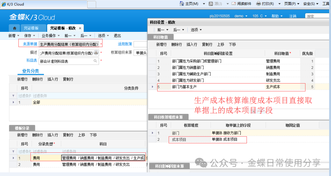 c、修改生产费用分配结果凭证模板,生产成本科目核算维度取数来源改为取单据体上的成本项目字段。