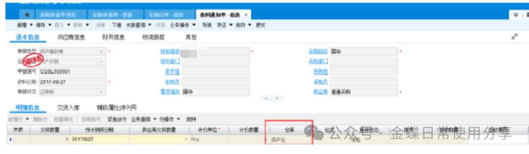 【操作说明】:采购订单下推收料通知单,若实际业务需要入库且该资产物料设置了允许库存,则填写仓库,否则直接提交审核,没有入库动作的直接看2.8。