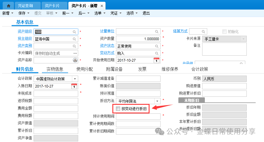 2. 若新增卡片时未勾选以上参数,后续做资产变更,变更了财务页签下信息时,会自动勾选该参数,然后按照该折旧方法下动态折旧公式进行折旧;