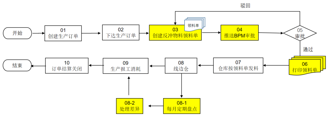 反冲物料从原材料仓库转移至车间线边仓,必须先申请并且批准后才能转移,领料申请单要参考生产订单的反冲物料的标准用量进行申请,反冲物料领料单要区分为计划领料申请单和超额领料申请单(超过订单的标准用量的领料)。