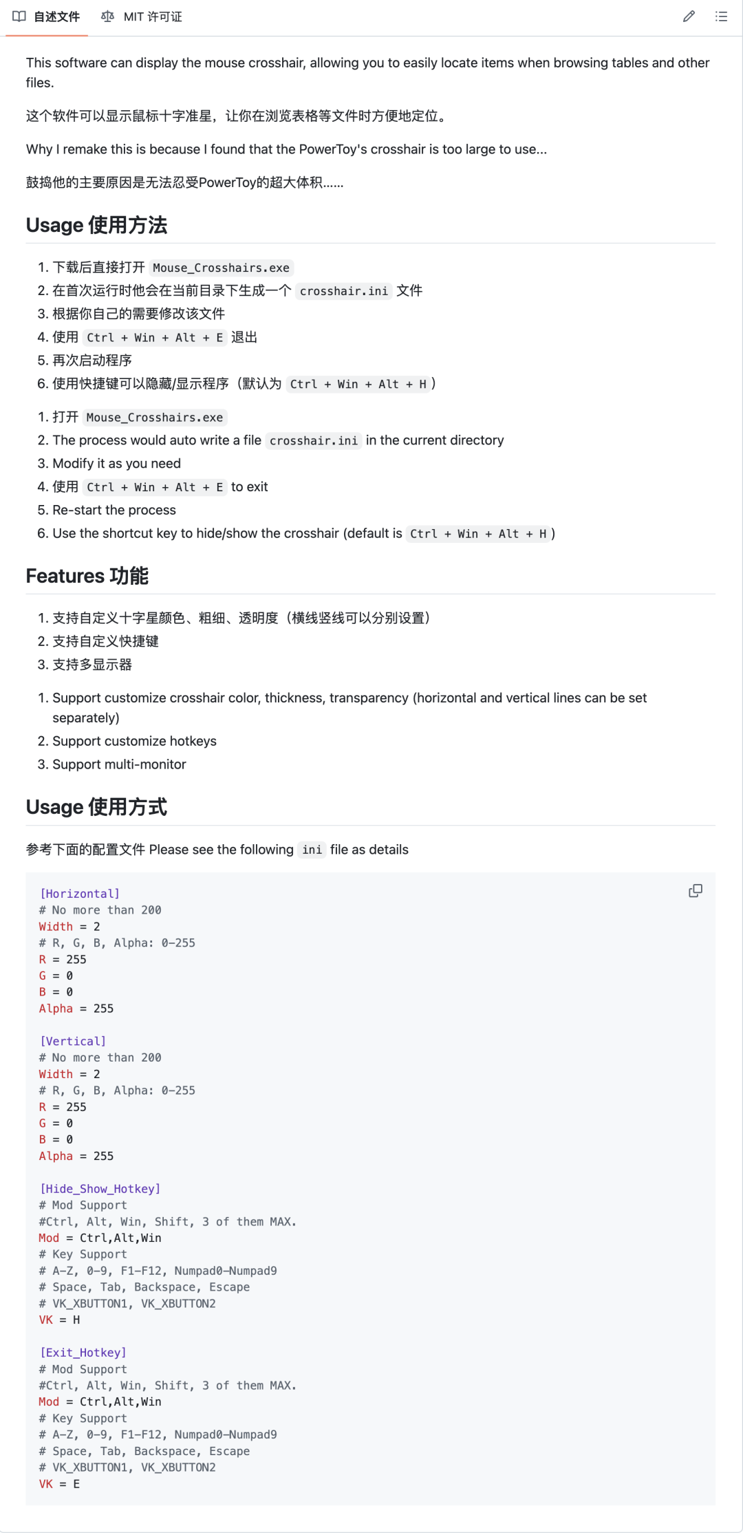 - • 轻量设计:单 exe 文件,运行后生成 crosshair.ini 配置文件,无复杂依赖;