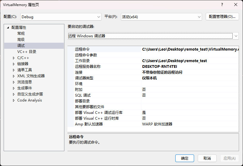 • 远程命令:填入测试机(或虚拟机)可执行文件路径。如 C:\Users\Leo\Desktop\remote_test\VirtualMemory.exe