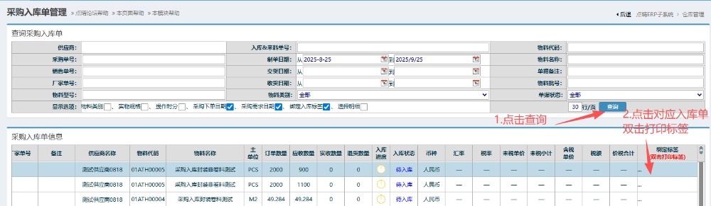 6.进入界面后,点击查询,然后找到对应入库单点击并拉到最右边双击打印标签,弹出信息窗口