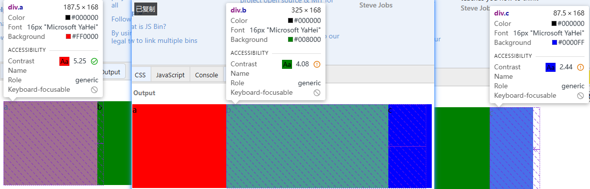 演示地址:https://jsbin.com/fibecijohi/edit?html,css,output 计算解析: Flex容器container下有三个子项分别为a,b,c 容器的宽度为600 总的basis = 0(a)+200(b)+100(s) = 300 总的grow = 1(a)+2(b)+3(c) = 6 a项的宽度= 0 + (600 - 300) * 1/6 = 50 b项的宽度= 200 + (600 - 300) * 2/6 = 300 c项的宽度= 100 + (600 - 300) *3/6 = 250 当空间不足时,flex-shrink生效,元素尺寸变小一起减小不足的空间当前项的最终宽度 = basis - (总的basis - 容器宽度) * (当前项的basis * 当前项的sthrink)/(各元素的basic * 各元素的shrink之和),下面来看一个示例 代码如下: