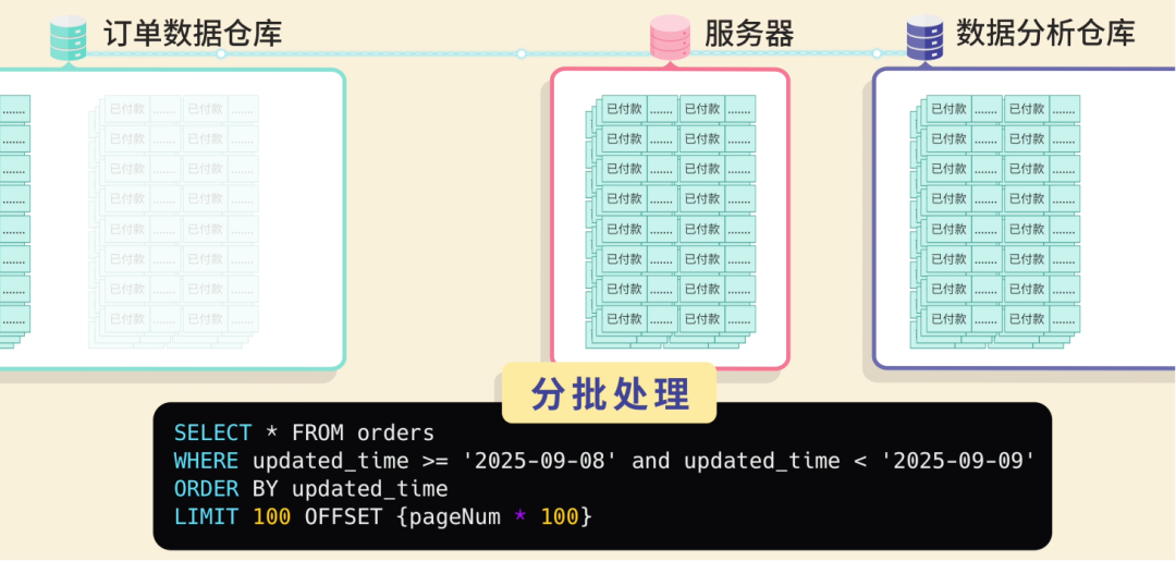查询结果返回订单 A(08:00)和订单 B(09:00),同步完成后将偏移量调整为下一页 可就在查询下一页前,订单 B 因为 “修改订单状态” 被更新,这时订单 B 的更新时间就不在查询范围内了。 这就导致查询下一页 ![]() 怎么解决这个问题呢? 这可难不倒你小阿巴,既然 动态数据集 中使用 SQL 自带的 OFFSET 偏移作为分页起点会出问题,那不妨 自定义一个标志来记录下一批要同步的起点。 这就是游标机制。 比如我约定自增的主键 id 作为游标,每查询一批数据之后,把这批数据的最后一条记录作为新的游标值;查询下一批数据时,只查询 id > 游标的数据。 ![]() 这样不仅防止数据丢失,还避免了 OFFSET 深度分页带来的性能问题。 此外,如果把游标想象成进度条的断点,可以更清晰地记录同步进度,失败后可以从断点继续。 做完这一通优化后,你长吁了一口气,工作看来是保住了。 ![]() 性能优化你以为终于可以安稳一段时间了。但没想到,公司的好日子才刚刚开始。 随着老板大力扩张业务,公司每天的订单量可以达到百万条,你的同步任务每次要跑几个小时才能完成。 更要命的是,老板现在对数据的依赖越来越强,要求每隔 2 个小时就要同步一次数据! 怎么能够让任务执行更快呢? 这时,你想起了曾经在 程序员面试神器 - 面试鸭 上背过的各种性能优化八股文。好家伙,终于能派上用场了! ![]() 首先,修改插入数据库的操作方式。之前是一条一条地插入订单数据,改为执行一条批处理语句来同时插入同一批内多个订单数据,减少了跟数据库通信的次数,性能大幅提升。 ![]() 但是你觉得还不够快,于是优化了批处理的流程。之前是等一批同步完再同步下一批,串行执行;现在你启动了多个线程,每个线程负责处理一批订单的同步,多个线程可以同时搬砖干活,效率大幅提高。 ![]() 这一通操作下来,老板都激动了:“小阿巴,你这技术可以啊!好好干,我给你升职加薪!” 你笑了,有了老板这句话,你想继续努力给公司卖命了。 ![]() 实时同步两年后,随着你头发的消逝,公司总部决定要上市了! ![]() 老板找到了你:“阿巴阿巴,咱们的数据同步能不能做到实时?我想给投资人展示实时的业务监控。最好是用户刚下单,投资人立刻就能在大屏幕上看到!" ![]() 你早料到会有这个需求,帅气地甩出一句话:“交给我吧,我让你见识一下企业级方案!” ![]() 这两年你也没闲着,像实时数据分析这种典型需求的实现方案,你早已烂熟于心。 普通的定时任务已经无法满足实时性的要求,只能搬出 CDC + 消息队列 这两大杀器了。 CDC(Change Data Capture)就像给数据库安装了一个 24 小时实时监控的摄像头,数据有任何变化,摄像头都能立刻发现。 消息队列就像一个快递中转站。数据库变化的消息先发送到这个中转站,然后同步数据的程序从中转站取出数据并写入到数据分析仓库中。 ![]() 有了中转站后,如果消息特别多,程序来不及处理,也不会丢失数据。 实现了这套方案之后,用户只要一下单,100 毫秒内老板就能在仪表盘上看到。而且保险起见,你还给消息队列加了个监控,如果消息堆积太多,就会自动告警。 他开心得像个孩子:“小阿巴,我给你升职加薪,还给你带新人!” 你又笑了,开始幻想着你和新人坐在高高的办公桌上,你给他讲述自己光辉事迹,他向你投来羡慕的目光。 ![]() 方案完善半个月后,公司迎来了双十一大促活动。 你正在和新来的实习生阿坤吹牛皮,没想到瞬间产生了大量订单,像洪水一般,让你的实时同步系统出现了各种异常: