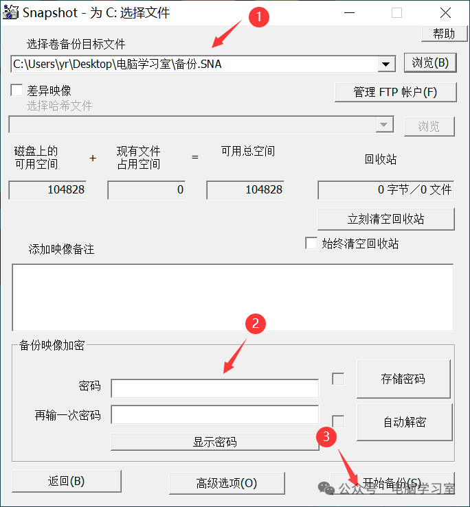 2、选要备份位置,备份镜像可进行密码加密,点开始备份即可。