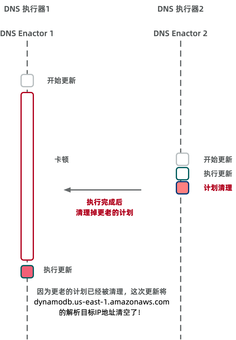在本次事件发生前夕,一台 DNS 执行器在更新多个端点时遭遇了异常高的延迟,不得不对几个 DNS 端点进行了多次重试。当它以缓慢的速度逐步处理这些端点时,又发生了几件事:首先,DNS 规划器继续运行并生成了多代更新的方案;其次,另一台 DNS 执行器开始应用其中一个较新的方案,并快速地完成了对所有端点的更新。这一系列操作在时间上的巧合触发了那个潜伏的竞态条件。