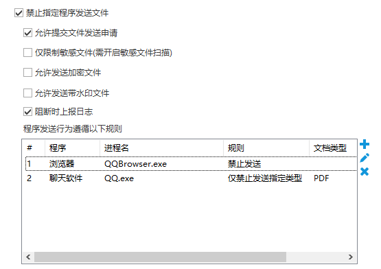 ⑥禁止程序发送文件 设置下班后的时间,禁止程序发送文件,如果有恶意程序控制计算机在下班时间发送文件,客户端软件会直接拦截,禁止外发,防止银狐控制计算机私自传播文件。