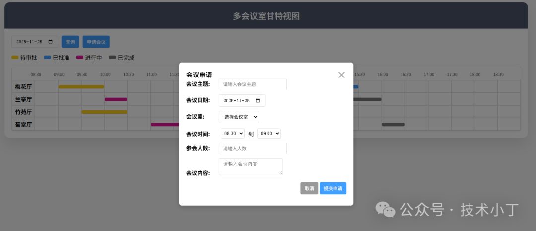 控制面板位于页面顶部,提供日期选择和基本操作按钮。这个区域允许用户选择查看的日期,并提供了申请会议的按钮。 <div class="controls"> <input type="date" id="dateInp"> <button onclick="search()">查询</button> <button onclick="openApplyModal()">申请会议</button></div>