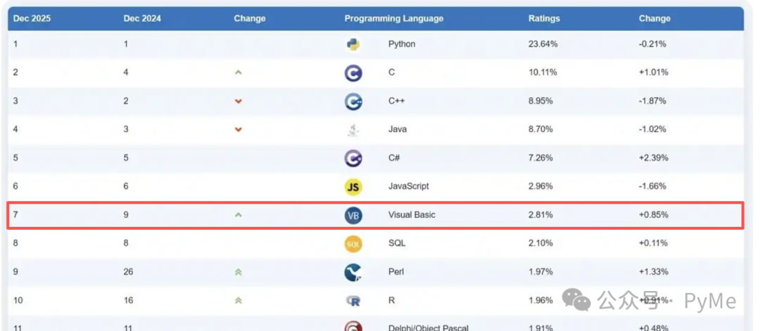2025年12月的TIOBE编程语言排行榜呈现出一幅耐人寻味的图景:在AI浪潮席卷全球、Python连续多年称王的背景下,27岁“高龄”的Visual Basic竟以2.96%的市场份额位列第七,且本月上升0.85%。这一现象看似反常,实则揭示了一个被现代开发社区忽视的真理——全流程、可视化、工程化的开发理念,其价值从未衰减,只是载体正在变迁。