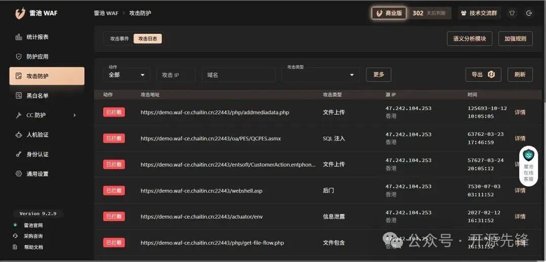 后台同样捕获到了这个攻击记录。 场景3:恶意扫描请求第三个场景,开源君刻意换了一种思路:不利用 web页面的漏洞,而是模拟真实攻击者的扫描行为。 在很多真实攻击中,黑客并不知道目标是否存在漏洞,而是会不断尝试在 URL 参数中注入诸如 在 3000 端口下,加上这种参数,页面照样正常打开,看起来什么事都没发生。但从安全角度看,这其实是最危险的状态:恶意请求已经顺利进来了,只是暂时没踩到雷。