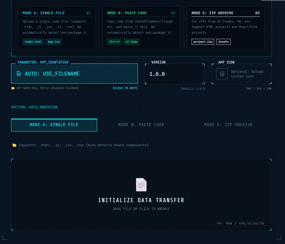 🆔 网站名称:Demo2APK ![]() 🔗 网站链接:点击打开 https://demo2apk.lasuo.ai/ ⭐ 网站功能:代码转Android APK 📁 网站简介:一款将HTML或React项目快速转换为Android APK应用,无需编写代码,只需通过简单的上传或粘贴操作,即可将AI生成的代码打包成可安装的应用。 站支持多种文件格式,包括.html、.js、.jsx、.ts和.tsx,可以选择单个文件上传、直接粘贴代码或上传ZIP压缩包。 特别适合使用AI工具(如ChatGPT、Gemini)生成内容的用户,使得其创作的项目能够快速实现为移动应用。 该文章在 2025/12/31 18:52:17 编辑过 |
