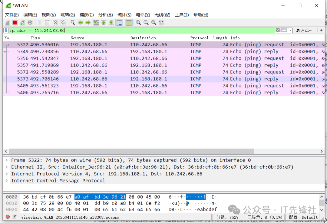 过滤出百度的IP地址查看 5、操作完成后相关数据包就抓取到了。为避免其他无用的数据包影响分析,可以通过在过滤栏设置过滤条件进行数据包列表过滤,获取结果如下。说明:ip.addr == 110.242.68.66and icmp 表示只显示ICPM协议且源主机IP或者目的主机IP为110.242.68.66的数据包。说明:协议名称icmp要小写。