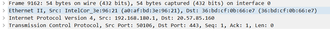3. Packet Details Pane(数据包详细信息), 在数据包列表中选择指定数据包,在数据包详细信息中会显示数据包的所有详细信息内容。数据包详细信息面板是最重要的,用来查看协议中的每一个字段。各行信息分别为