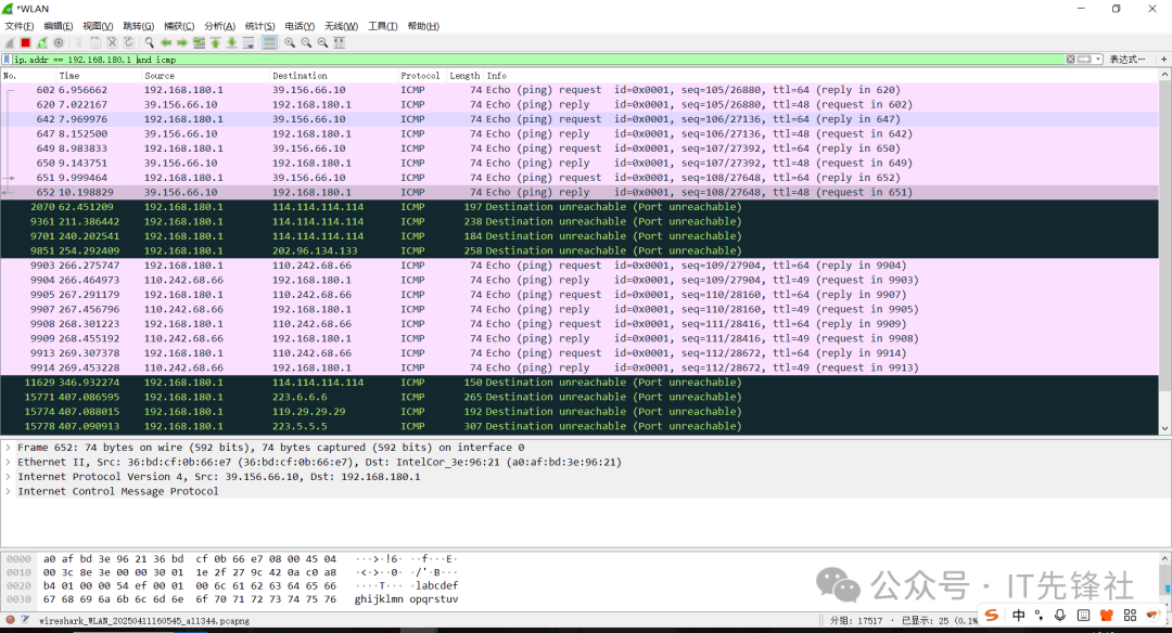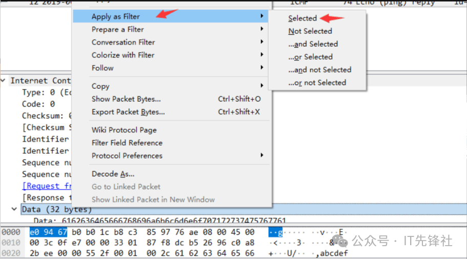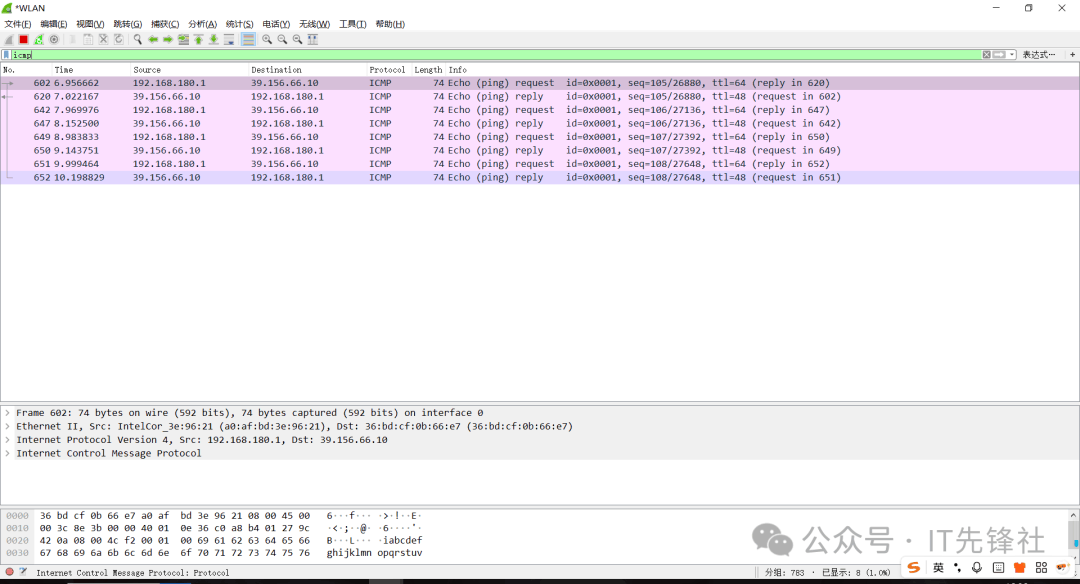 (7)按照数据包内容过滤。假设我要以IMCP层中的内容进行过滤,可以单击选中界面中的码流,在下方进行选中数据。如下