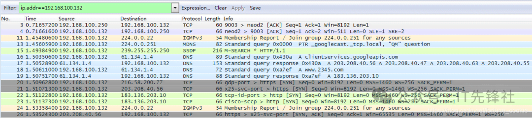 (2)在工具栏上的Filter对话框中填入过滤条件:ip.addr==192.168.100.132,过滤结果如下: