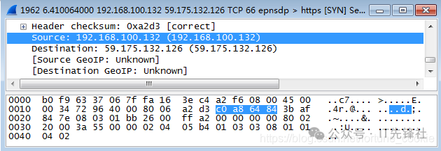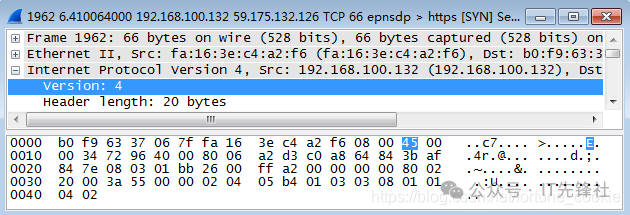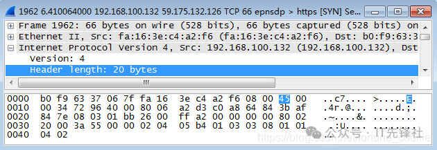 双击点击一条tcp报文进入详细信息,那为什么不选Protocol类型为IP的协议呢? 答案是没有,tcp报文正是基于ip协议的,tcp是传输层协议,而ip是它底下的网络层协议。 第四步,分析IP数据包,根据图中的数据帧格式,分析IP包的各部分。