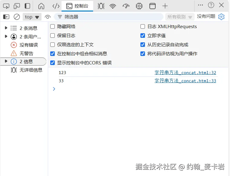 今天我们来学习下JavaScript的一种字符串方法, 字符串方法_concat()方法 concat()用于连接两个不同的字符串,返回一个新字符串,不改变原字符串 示例对比: 如果是连接两个字符串分别使用两种方法 使用 concat()方法: 接下来看看 + 运算符 let a="Hello"; let b="World"; let result=a + " " +b; // "Hello World"