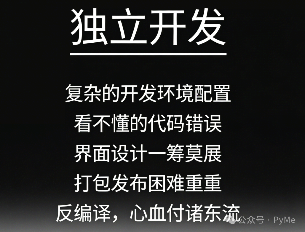 然而,当你满怀热情打开电脑,准备大展身手时,现实往往给你当头一喝:复杂的开发环境配置、看不懂的代码错误、界面设计一筹莫展、打包发布困难重重……更令人沮丧的是,好不容易开发出的软件,竟可能被人轻易反编译,心血付诸东流。 “要是能用Python开发软件,该多好啊!”——数百万开发者的共同心声在众多编程语言中,Python无疑是最亲民的选择。它语法简洁如英语,学习曲线平缓;功能强大到从数据分析到人工智能无所不能;社区活跃,海量开源库任君取用;更重要的是,它与当前最火的AI技术天然契合,让“AI辅助编程”从概念变为日常。 但就是这样一门近乎完美的语言,却在应用软件开发领域存在几个“先天不足”,让无数开发者又爱又恨: 痛点一:界面开发“老大难”