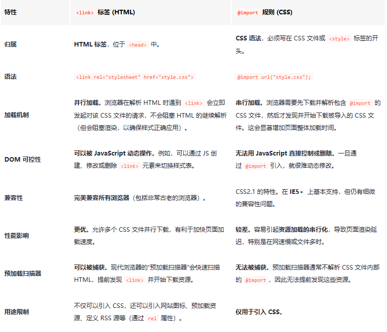 这是一个非常经典的前端问题。<link> 和 @import 都是用来引入外部 CSS 文件的方法,但它们在加载机制、性能、兼容性和控制力上有显著区别。