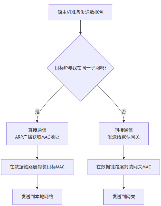 当一台计算机(源主机)想要与另一台计算机(目标主机)通信时,它遵循以下决策流程: