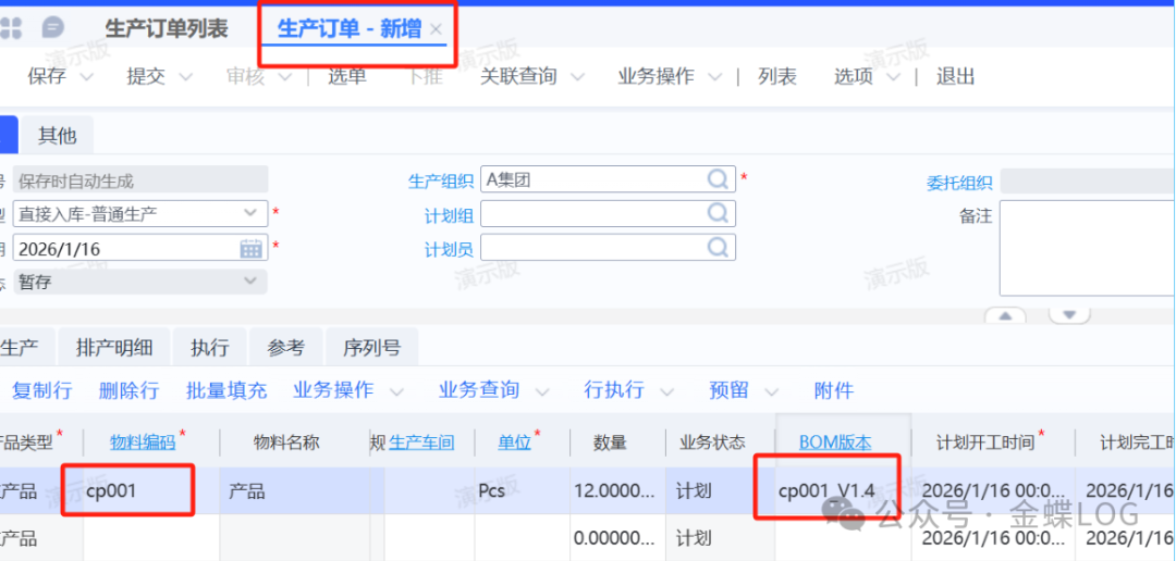 在下生产订单的时候,明细页签里面有个【BOM版本】字段,这个默认携带产品料号对应的最高版本BOM