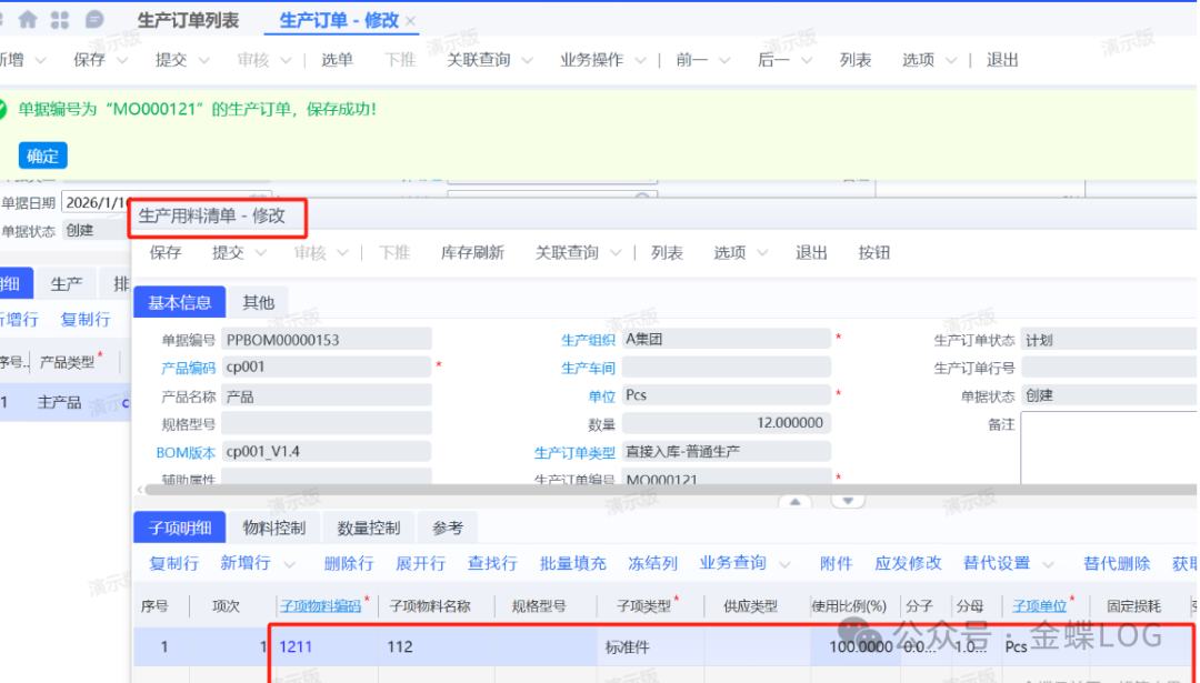 保存之后通过【物料清单】-【业务操作】里的【同步更新】按钮同步一下工单MO000121的【生产用料清单】。