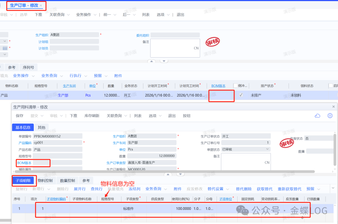 如果【生产订单】没有填BOM版本的话,生成出来的【生产用料清单】子项页签数据便为空,但工单是可以正常保存开工的;如果用料清单数据为空,下推领料单的时候就不会有物料。所以为空时要确认下是不是【物料清单】没建好