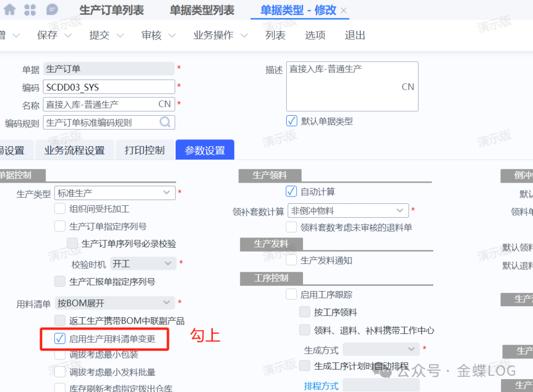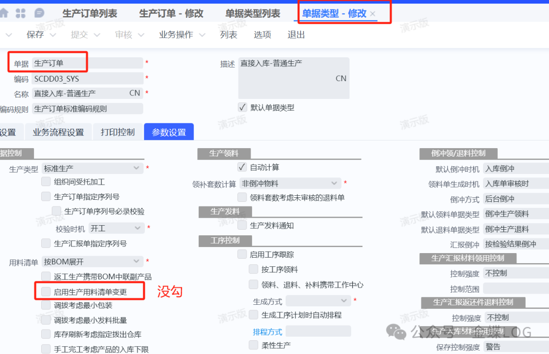 我们可以打开【生产订单】对应的【单据类型】,看下是否有勾选【启用生产用料清单变更】没有勾则说明没启用。