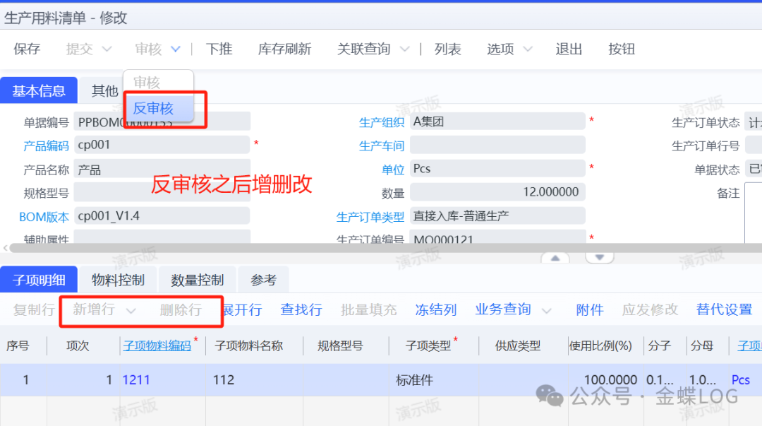 注意:如果生产订单还在【计划】或【计划确认】状态的时候,用料清单是能直接反审核修改的,上面也强调了是在【下达】之后。